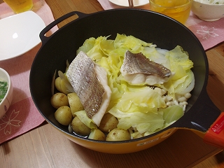 初めて切った野菜はキャベツ。鯛とシメジと新タマネギ、新ゴボウに新じゃが・・・