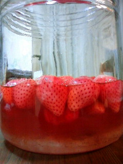 夜にはいい感じのイチゴ色に染まっています。飲み頃は三週間後、それまでガマン。